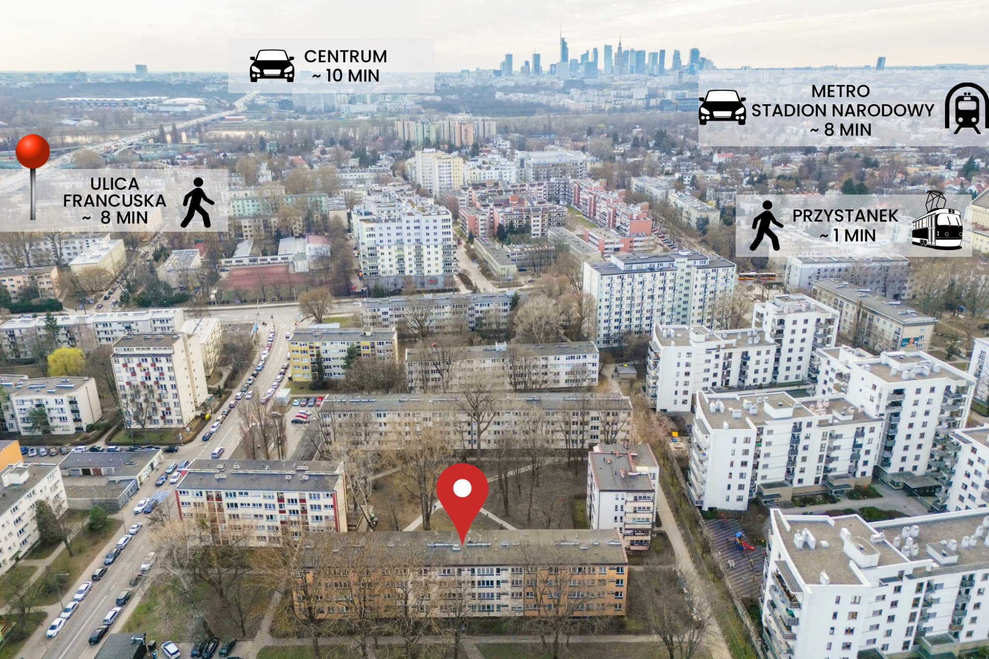 - ok. 10 minut komunikacją miejską do metra Stadion Narodowy oraz do centrum Warszawy